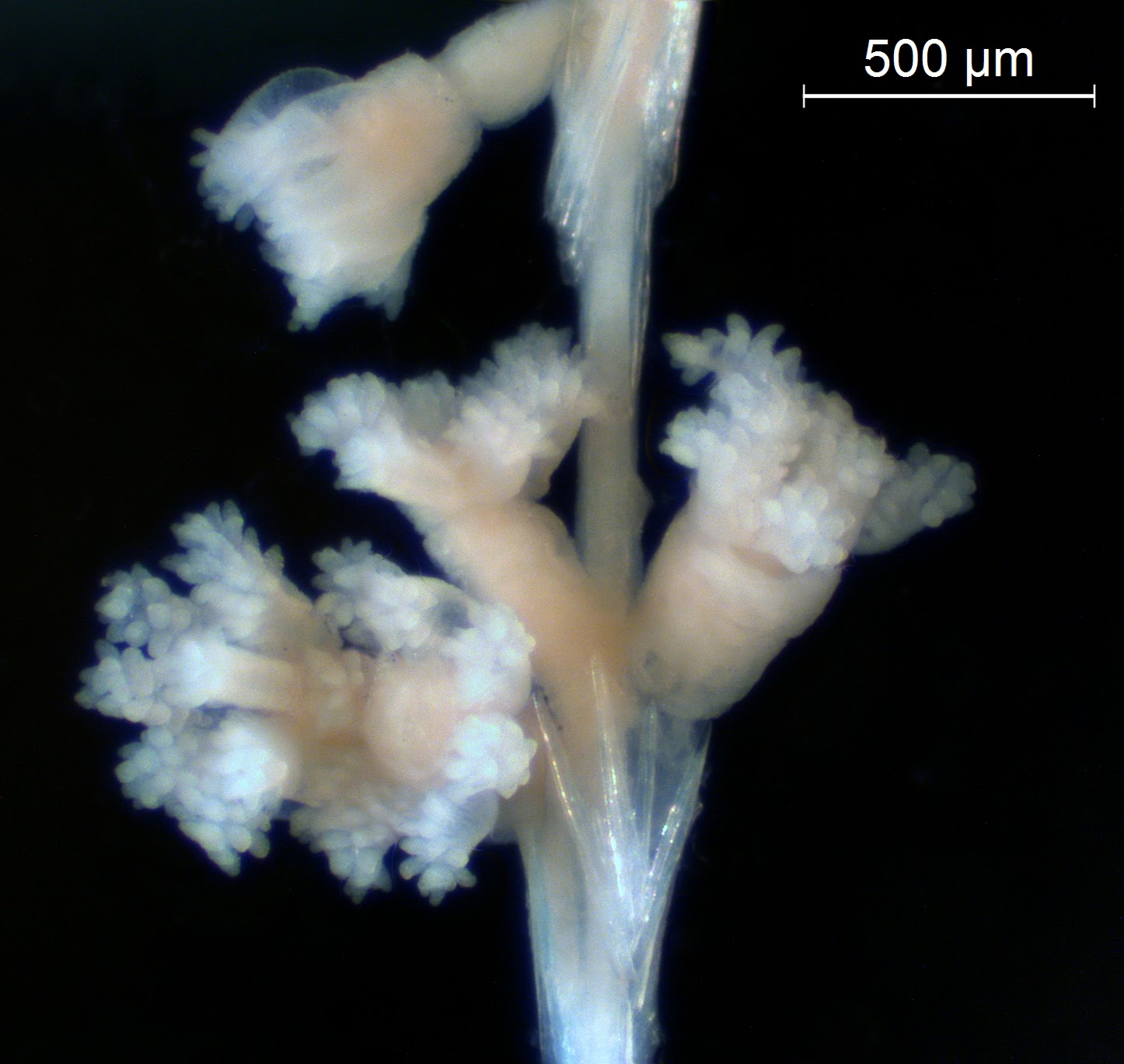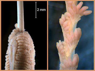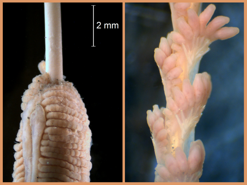 | LEFT: Part of S. elongata with the supporting skeletal rod exposed. RIGHT: Close-up of polyp clusters with needle-like spokes called sclerites. |
